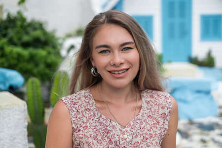 Close-up portrait of attractive caucasian young woman with blond hair, wearing casual dress. Looking at camera with copy space