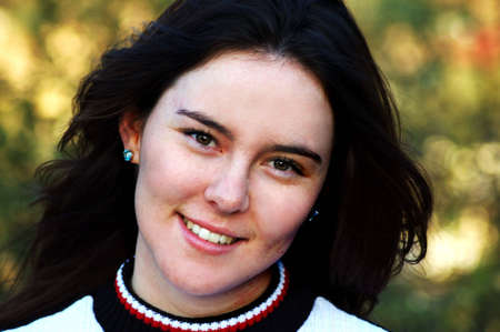 Outdoors portrait of beautiful young woman with green eyes.
