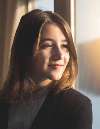 Close up Young woman with soft sunset, contrasting colors, dynamic lighting on digital art concept.