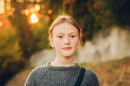 Outdoor close up portrait of young 10-11 year old girl in sunlight