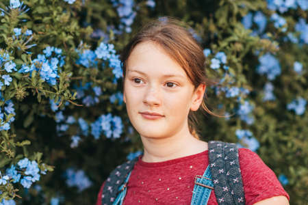 Outdoor portrait of pretty teenage girl, wearing overalls and backpack, posing on natural flower background