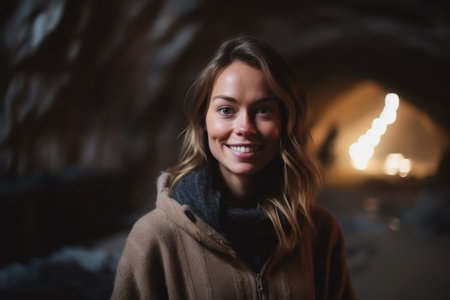 Portrait of young woman in underground cave. Smiling and looking at camera.
