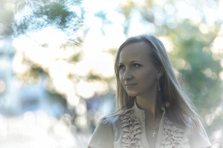 Portrait of young attractive woman enjoying warm sunny day in early spring outdoors.