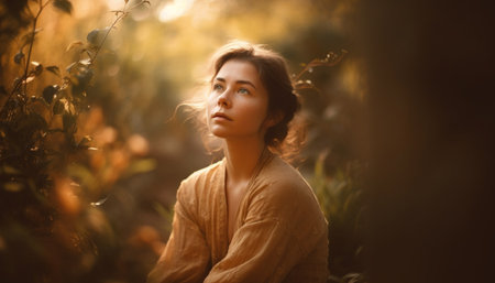 A beautiful, contemplative portrait of a woman looking up with a hopeful or inspired expression. She is illuminated by a warm, cinematic shaft of light, with dust particles visible in the air, creating a serene and ethereal mood.