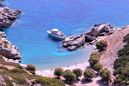 Beautiful view of the Mirabello bay. Near to Sitia and Agios Nikolaos. Landscape with turquoise sea, mountains and green nature.