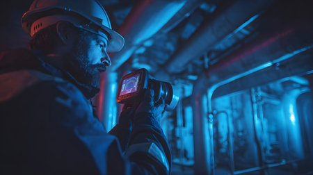 A worker wearing helmet and protective clothing using thermal camera for infrared leak detection industrial piping, focused inspection