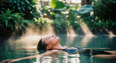 Young woman floating on her back in a warm, steaming thermal pool, surrounded by lush green plants. sunbeams pierce through the foliage, creating a tranquil and relaxing scene.