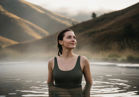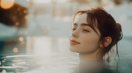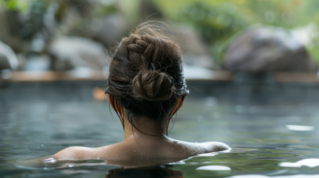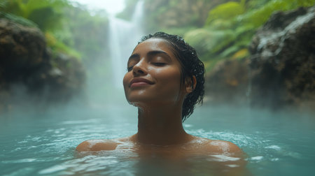 A serene young woman with wet hair stands in a natural hot spring, looking peaceful. this image evokes relaxation, wellness, and connection with nature.
