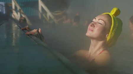 Close up caucasian woman in a swim in hot saline mineral water bath at a traditional spa outdoor with soft magic pink lighting steam. Geothermal spa.