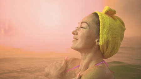 Close up caucasian woman in a swim in hot saline mineral water bath at a traditional spa outdoor with soft magic pink lighting and steam. Girl relaxing spring in hot geothermal spa pool is towel cap.