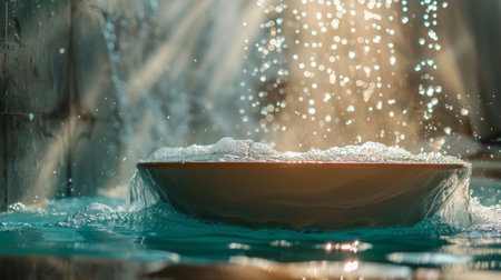 A serene scene of water splashing over a bowl, illuminated by soft sunlight and creating a dreamy, sparkling effect. Ideal for wellness or artistic projects.