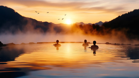 Tourists enjoying a relaxing bath in onsen at sunrise with birds flying and fog
