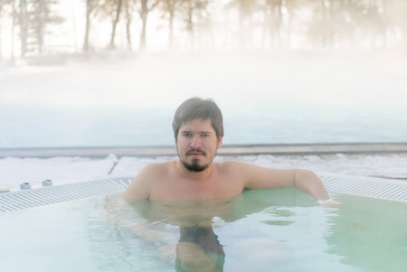 Young man in bathtub jacuzzi outdoors at winter day