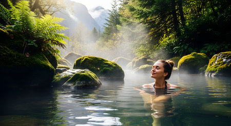 A serene woman relaxes with her eyes closed in a natural hot spring, surrounded by moss-covered rocks and ferns. Steam rises from the warm water, creating a peaceful and tranquil spa-like atmosphere. This image evokes relaxation, wellness, and a connection with nature.