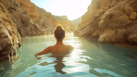 Relaxing in a serene hot spring surrounded by rocky formations and soothing steam at dawn. Generative AI