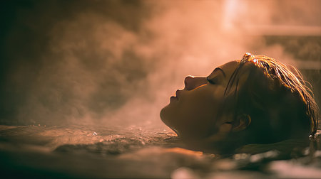 A young woman enjoys a peaceful moment in a warm bath, surrounded by soft steam that creates a tranquil and calming atmosphere, perfect for relaxation.