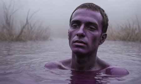 Mysterious purple man emerging from a foggy swamp, creating a surreal and evocative scene