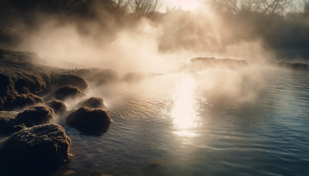 Sunlight reflecting on the surface of a steaming hot spring creating a relaxing atmosphere