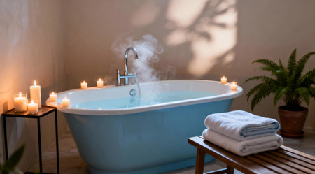 An inviting spa scene featuring a sleek white bathtub surrounded by softly glowing candles in various sizes. The ambiance is enhanced by muted indoor lighting and a palette of soothing pastel blues and greens, creating a tranquil environment. Ideal for wellness and relaxation-themed publications or home decor inspiration. AI-generated illustration.