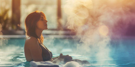 Woman immerses into luxurious spa pool enjoying quietude. Lady takes moment to rest and recharge allowing warm water to soothe body and mind