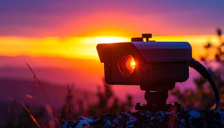 A small trail camera stands sentinel, its lens fixed on the horizon as it silently documents the breathtaking spectacle of a vibrant sunset. A fusion of technology and nature, capturing a fleeting moment of beauty for posterity.