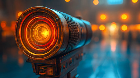 A close-up of a camera lens with glowing orange reflections, against a bokeh background of blue and red hues. Ideal for photography or technology concepts.