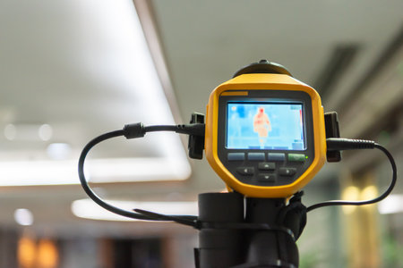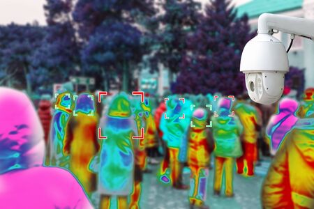 Thermoscan Infrared Camera scanning people who have fever, showing red color alert on high body temperature for outbreak control situation