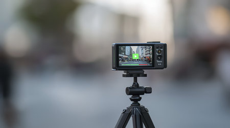 Small digital camera mounted on tripod captures city street scene with buildings and pedestrians, displaying video recording on its screen