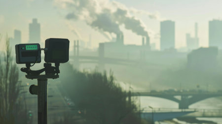 An urban landscape with air pollution monitors in the foreground, tracking pollutant levels in the atmosphere