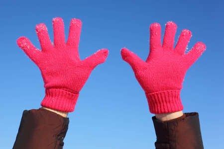 portrait of a girl in winter gloves with arms extended close up.