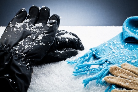 Gloves and a scarf over the snow for winter