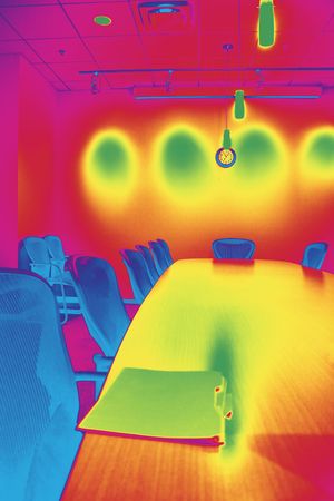 Thermal camera measuring heat from a ceiling hvac air vent.