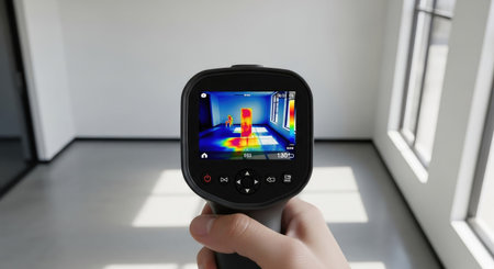Woman's Hand Using Infrared Thermal Camera To Check Temperature In Living Room