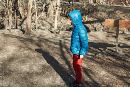 Preschool Caucasian boy walking alone in park forest outdoor. Lost kid alone looks worry concerned. Child standing in street outside looking for something and thinking. Candid portrait.