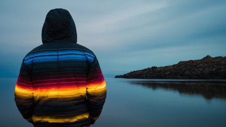 A person wearing a cozy blue jacket faces away from the viewer, their silhouette highlighted by a bright green background, creating a striking contrast that captures the essence of solitude.