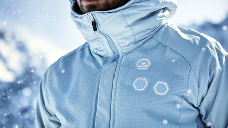 Smart winter jacket. Close-up of light blue high-tech winter jacket with illuminated hexagonal indicators in snowy conditions.