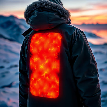 Heated ski jacket. Back view of ski jacket with heating panel during sunset in snowy mountains.
