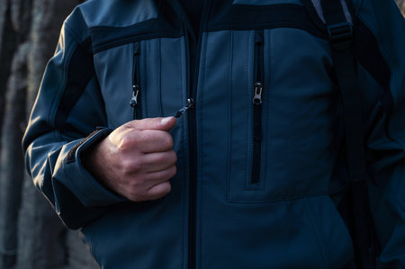 A young man looking down while fastening the zipper or velcro of a black hooded winter jacket. The close-up shot focuses on cold weather attire and the action of bundling up.