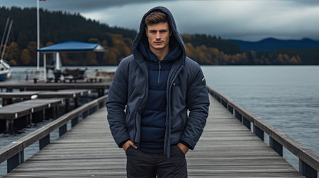 A stylish man in dark streetwear inspired jacket with orange accents