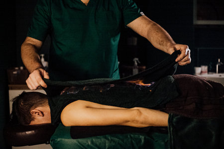 Huo Liao therapy - professional male masseur doing massage for woman client with hot towel at spa salon, studio. Warm romantic illumination, low key. Wellness, relaxation and healthcare concept