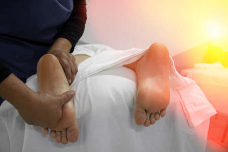 Beautiful legs of woman on white towel while male masseur healing body treatment on health clinic