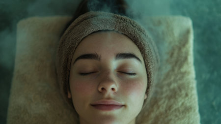 Top-down close-up of a tranquil woman with a towel headband, eyes closed, with gentle steam around her face, suggesting a calming spa or skincare session