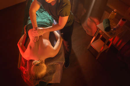 Man gives a back massage to a blonde in a dark light. Masseur works in his office in the semi-darkness. Chiropractor treats the patient's back. Physiotherapist giving massage to a woman in cabinet.