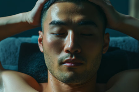Relaxed Young Man Meditating with Hands on Head, Eyes Closed in Calm and Peaceful Setting.