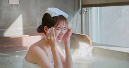 asian young woman has headache in hot spring