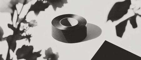 Minimalist collage featuring geometric shapes and a close-up of gaffer tape on a white background