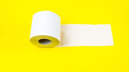Roll of cash register tape, empty blank tax receipt on table isolated. Planning savings, spending money or business concept.