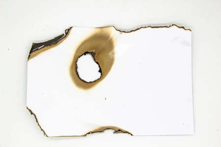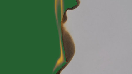 Flaming white sheet of paper with yellow flames and black charred edges. Blazing fire burns a hole in blank sheet, turning it to ash and revealing green screen chroma key. Workspace, mock up. Close up