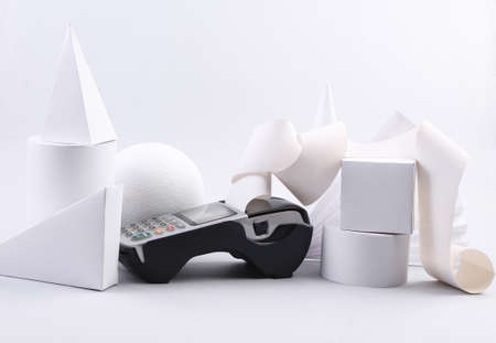 Payment terminal and white geometric shapes on a white background. Minimalism, concept art
