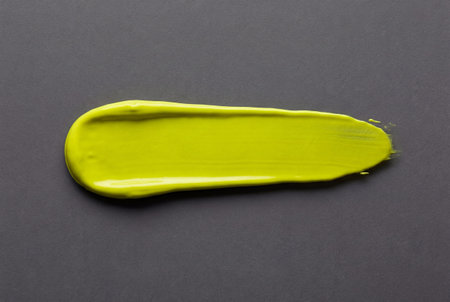 Elongated swatch of brilliant chartreuse pigment applied smoothly on dark gray surface highlighting creamy consistency and vibrant color intensity for makeup testing